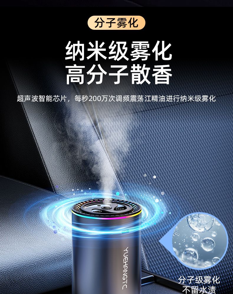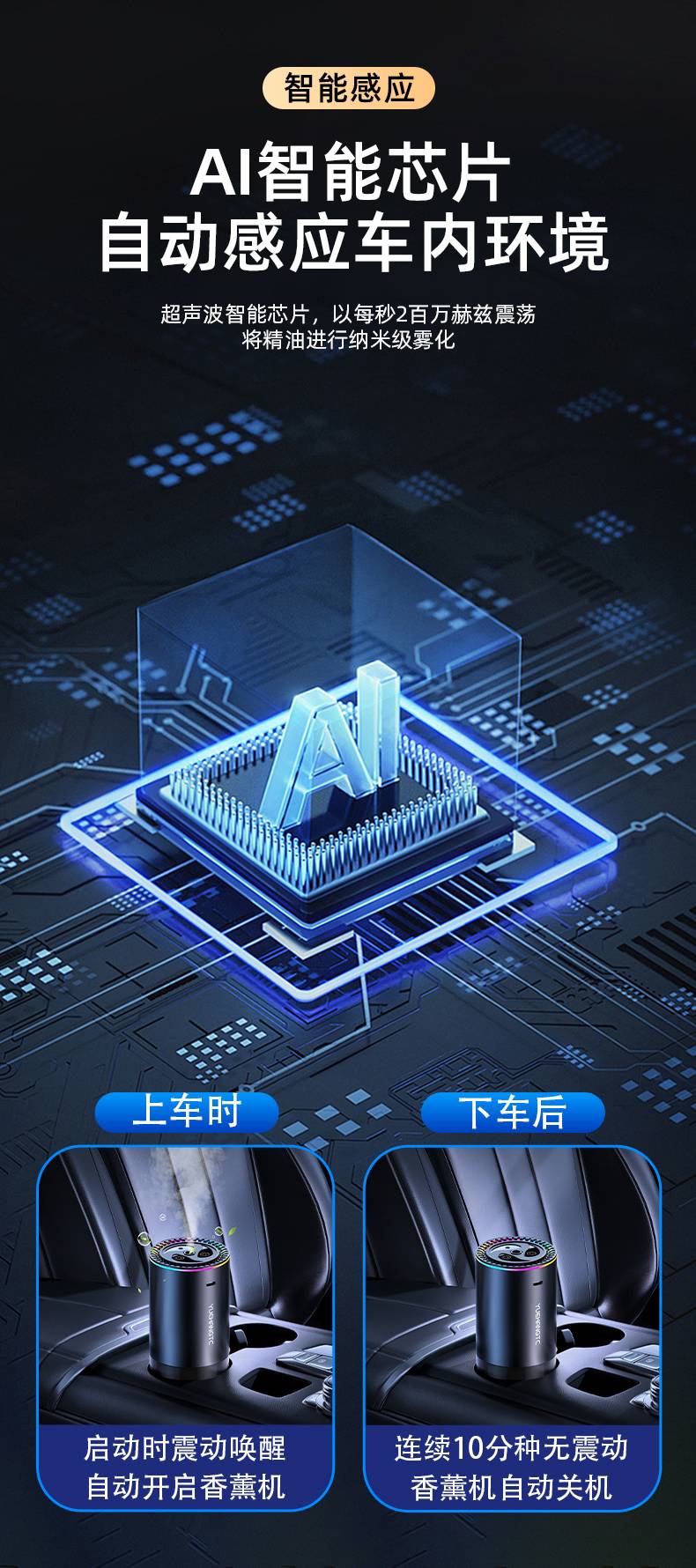 8. Intelligente Sensorik Der intelligente AI-Chip erkennt automatisch den intelligenten Ultraschallchip in der Fahrzeugumgebung und zerstäubt ätherische Öle im Nanomaßstab mit einer Vibration von 2 Millionen Hertz pro Sekunde